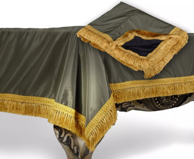 У нас в наличии есть покрывало для бильярдного стола размером в восемь футов. Это влагостойкое покрывало, изготовленное из синтетики, оно не пропускает сквозь себя пыль, грязь и воду. У покрывала темно-зеленый цвет, это очень глубокий оттенок, который смотрится дорого и эстетично, он будет уместен в любом бильярдном помещении. По краю покрывала проходит жёлтая бахрома, которая делает его еще интереснее и богаче.