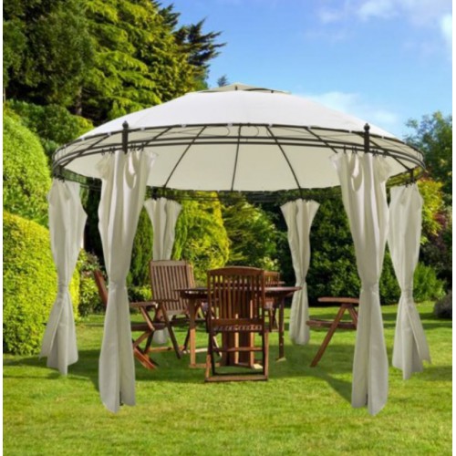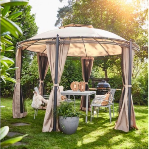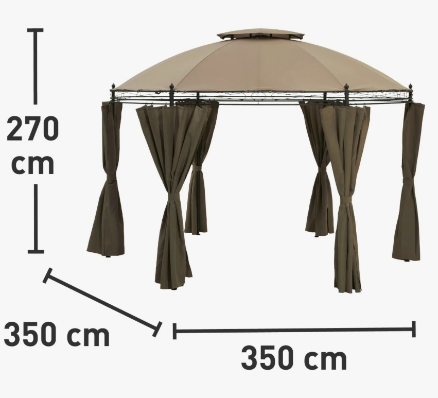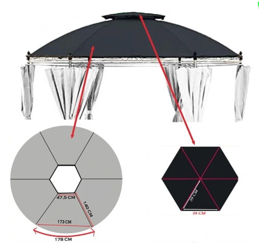 У нас вы можете приобрести круглую крышу, предназначенную для павильона, такая крыша имеет двойной вверх. У неё бежевый цвет, а также диаметр 3,5 метра. Также вы можете выбрать и другие цвета на выбор, например молочный, бежевый, цвет кофе с молоком, зелёный, а также коричневый. Изготовлена данная крыша из такого материала, как Оксфорд, а весит эта крыша всего 4 кг. Такая элегантная шестиугольная беседка будет смотреться очень дорого и очень стильно. Она состоит из шести опор, есть вентилируемая крыша, предназначенная для того, чтобы через неё лучше проходил воздух. Боковые стенки могут спасти вас от ветра и дождя.